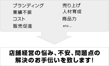 店舗経営に不安がある、店舗を良くしたい、とお考えの方は、業態を問わずお気軽にお問い合わせください。